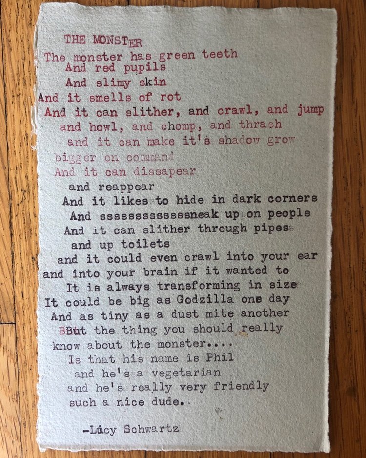• I didn’t originally set out to make a short film. A few years ago, I was at my typewriter, and I wrote a very quick stream-of-consciousness poem about a monster. When I shared it on instagram someone commented that it would be great as an animated short film. I thought so too. So I made it!